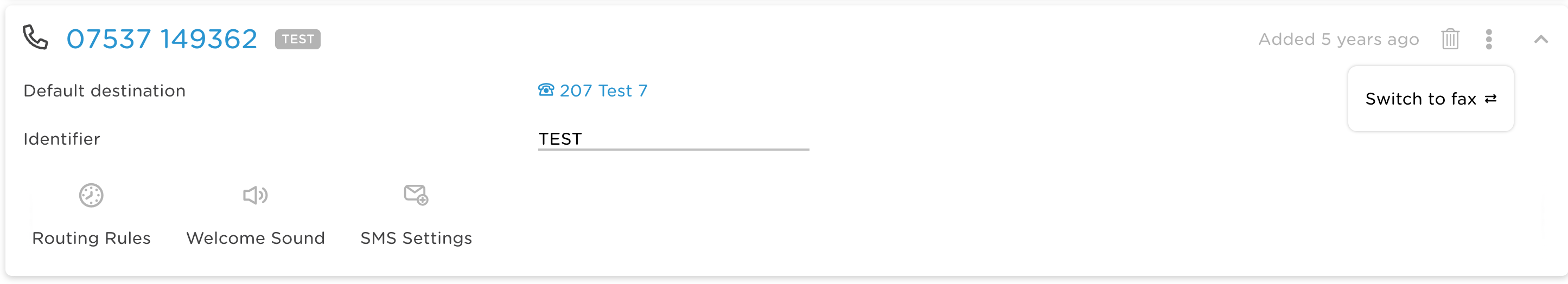 Switch to Fax converts the number into a fax line. Fax numbers are noted with a small fax machine icon