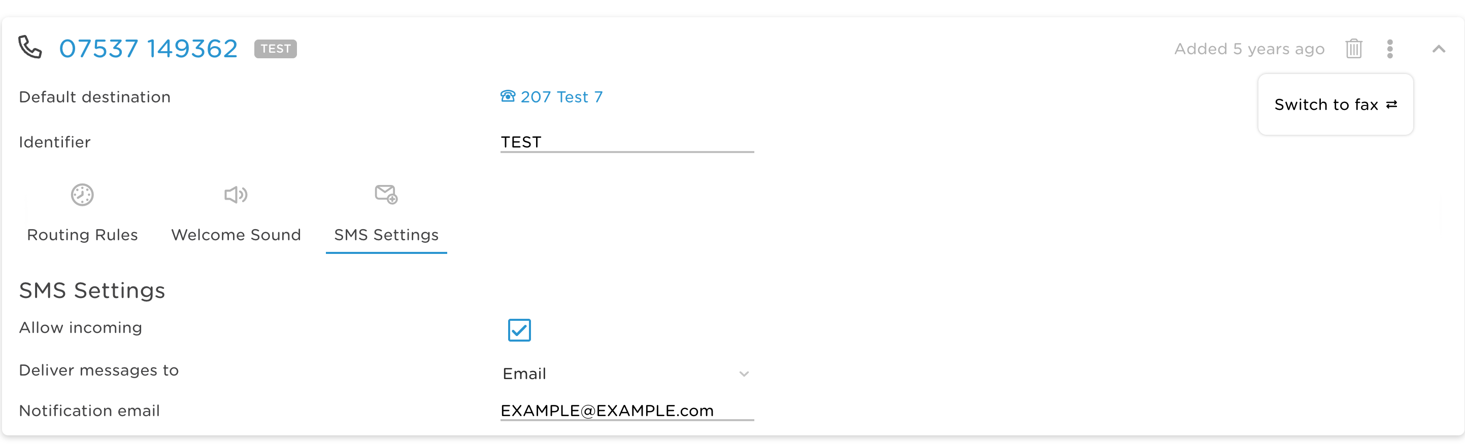 In the menu that appears, tick the Allow incoming checkbox, and enter the email address where incoming SMS messages should be delivered.